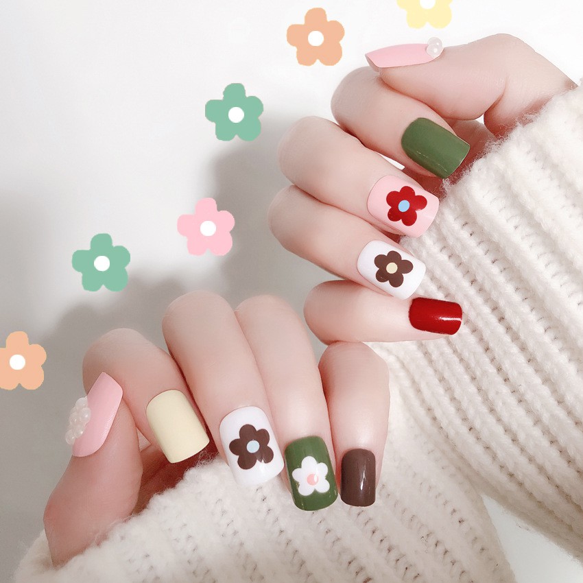 Buy 24pcs Green White Little Flower Fake Nail Art Decoration Short
